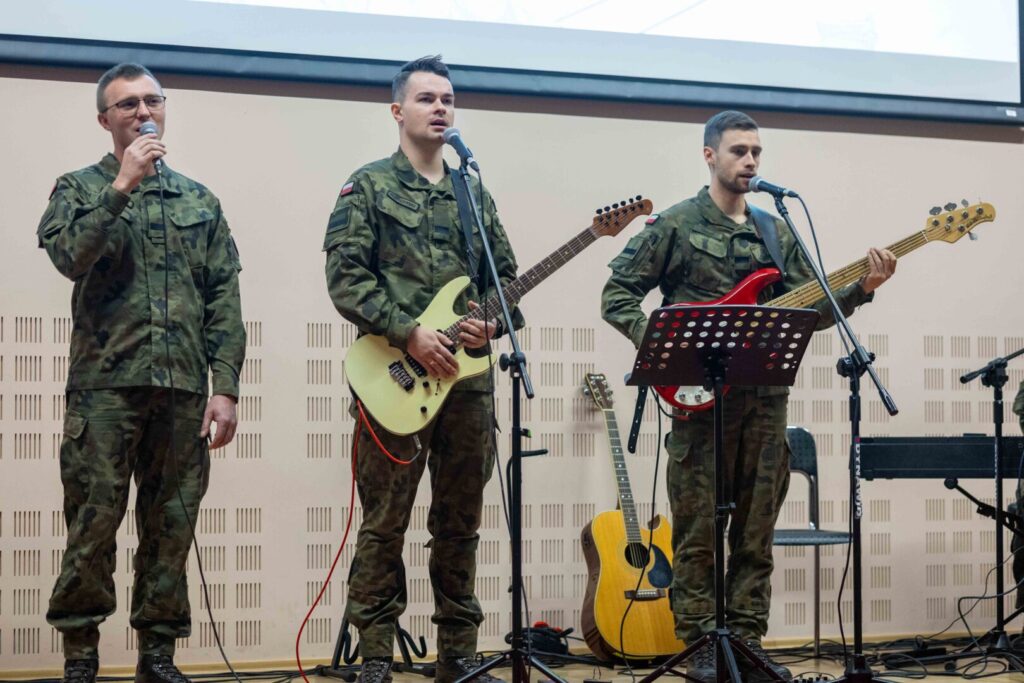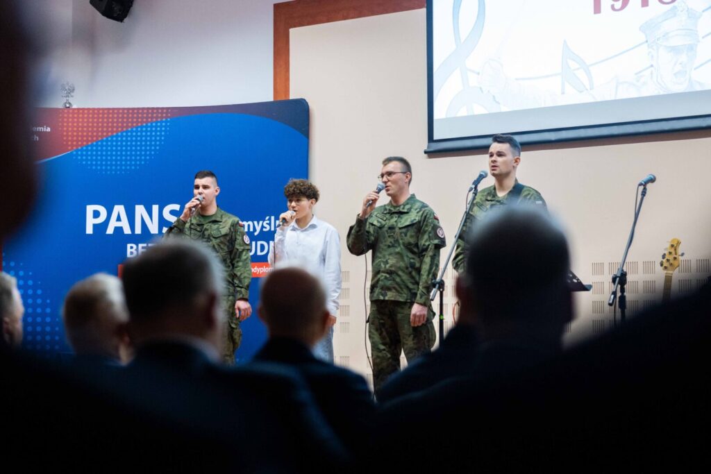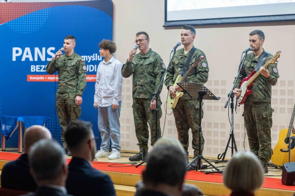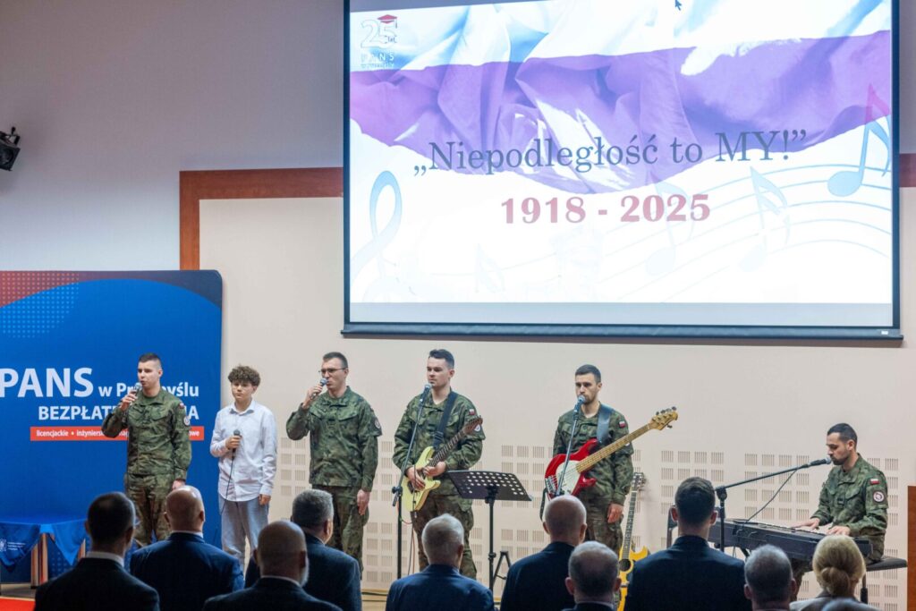 12 listopada 2025„Niepodległość to MY!” – dziś (12 listopada br.) w Auli Państwowej Akademii Nauk Stosowanych w Przemyślu pielęgnowaliśmy wartości patriotyczne, podtrzymując uroczystą atmosferę Narodowego Święta Niepodległości. Prelekcja rzecznik prasowej PANS – dr Eweliny Kasperskiej poświęcona znaczeniu i roli pieśni patriotycznej w życiu społecznym oraz koncert zespołu „Harnasie” z Klubu 5. Batalionu Strzelców Podhalańskich, były poruszającym spotkaniem z historią – poprzez słowo, dźwięk, obraz i emocje. Wykład dr Kasperskiej stanowił doskonałe wprowadzenie do części muzycznej – był on przypomnieniem, że muzyka od wieków towarzyszyła Polakom w chwilach próby, niosąc nadzieję i wiarę w wolność. Część artystyczna była prawdziwą ucztą dla ducha. Zaprezentowano znane i lubiane pieśni patriotyczne – publiczność chętnie włączała się do wspólnego śpiewu, a kolejne utwory nagradzano gromkimi brawami.
